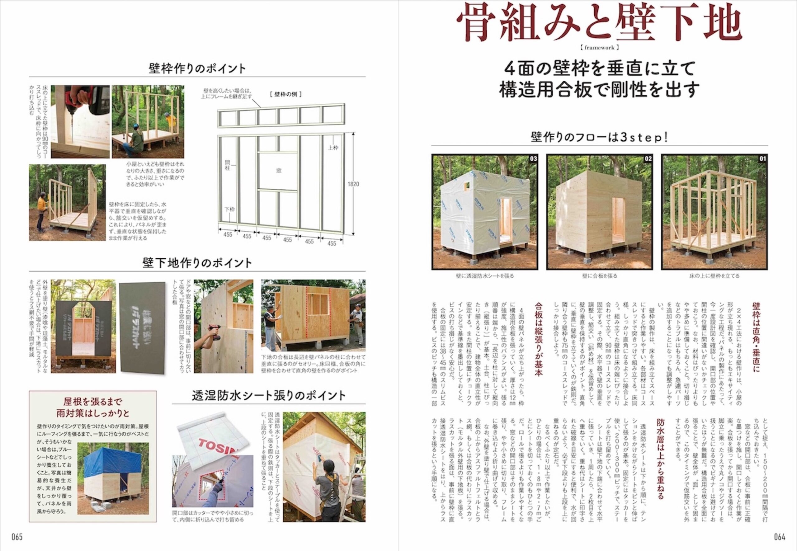 実作業に入る前の「プランニング」の進め方、選ぶべき「工法」に始まり、「基礎」「土台と床」「骨組みと壁下地」「屋根」「外壁」「建具」と小屋の基本形の作り方を押さえるのみならず、「断熱」「内装」「電気工事」「換気・冷暖房」と、より快適な小屋に仕上げる段階までをフォローしています。